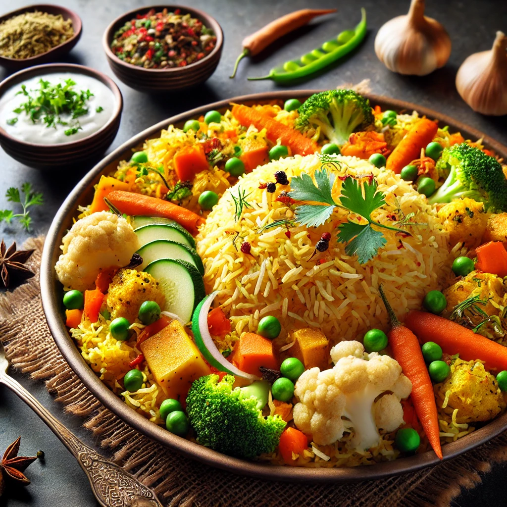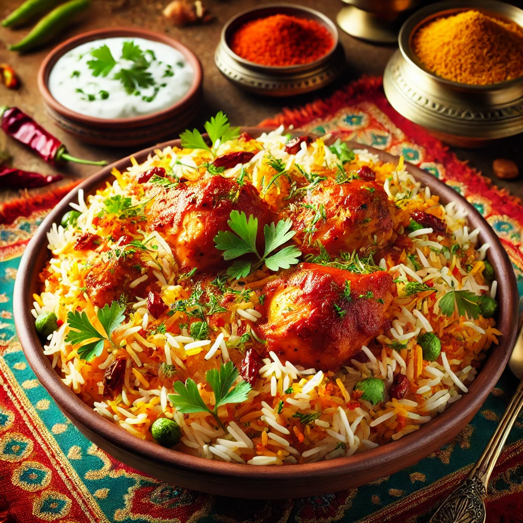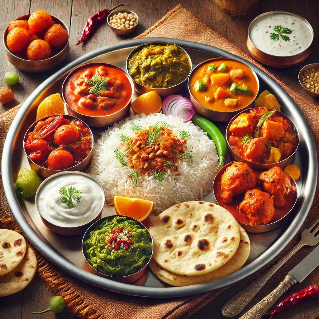 A wholesome Chicken Thali featuring Chicken Tikka Masala, Saag Chicken, Veg Handi, Tadka Dal, steamed rice, soft naan, refreshing raita, crispy papad, and a sweet Gulab Jamun for dessert. A complete meal that offers a delightful variety of flavors!